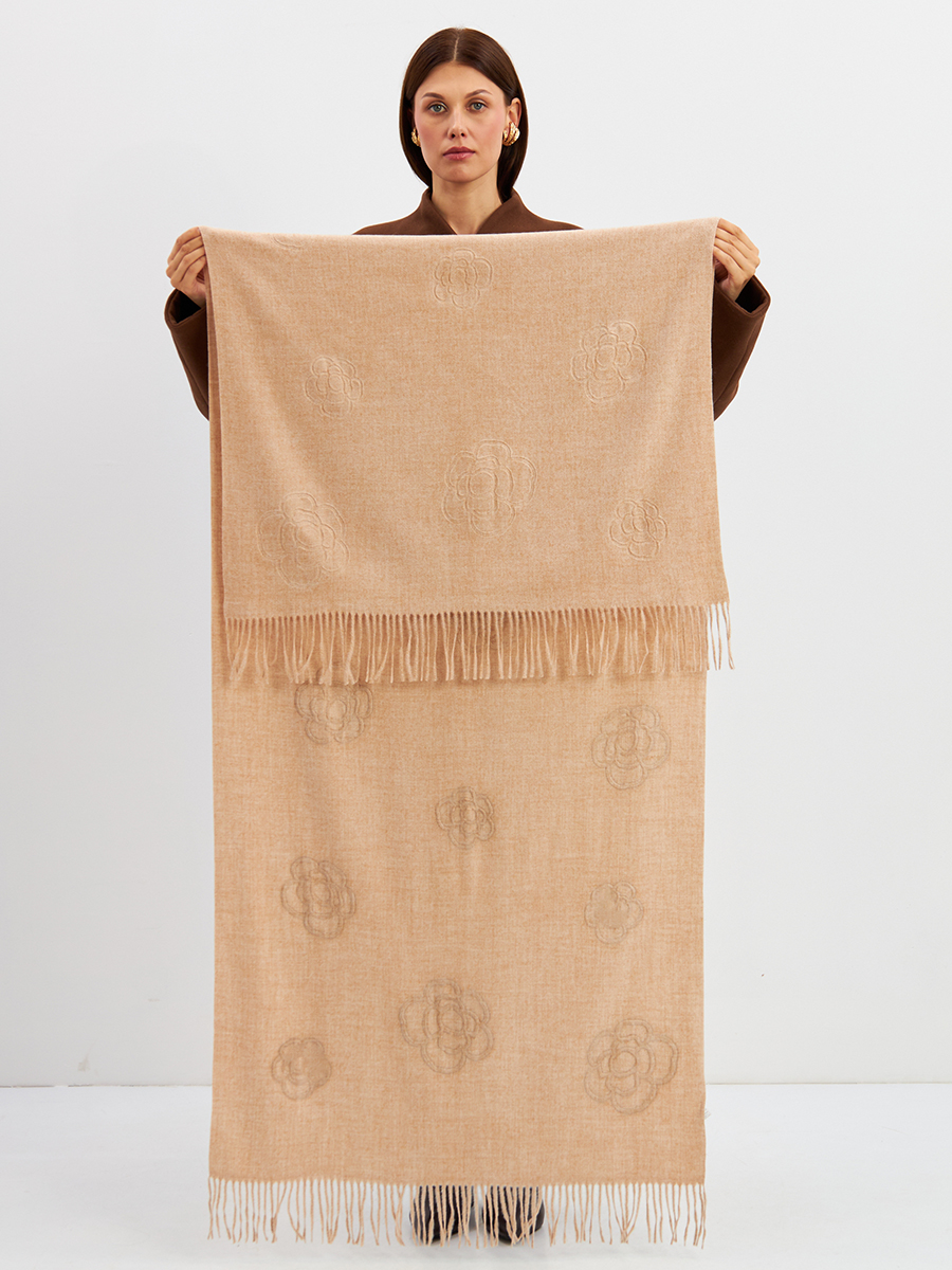 Большой, мягкий, теплый двусторонний однотонный палантин с принтом-печатью. Края изделия украшены бахромой. Машинная деликатная стирка. 55% Вискоза, 25% Кашемир, 20% Шерсть