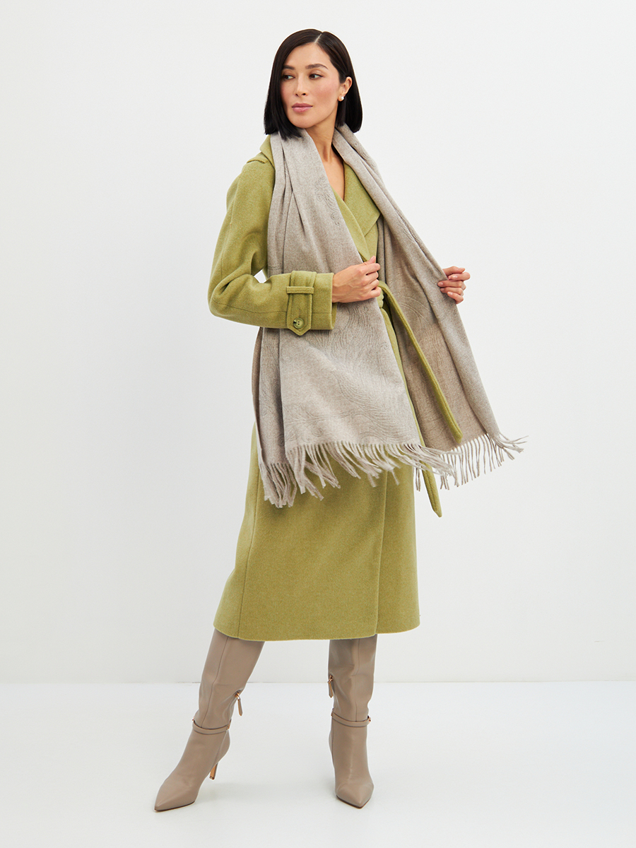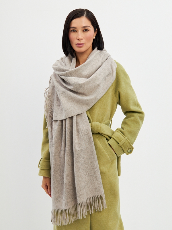 Большой, мягкий, теплый двусторонний однотонный палантин с принтом-печатью. Края изделия украшены бахромой. Машинная деликатная стирка. Кашемир 25% Шерсть 20% Вискоза 55%