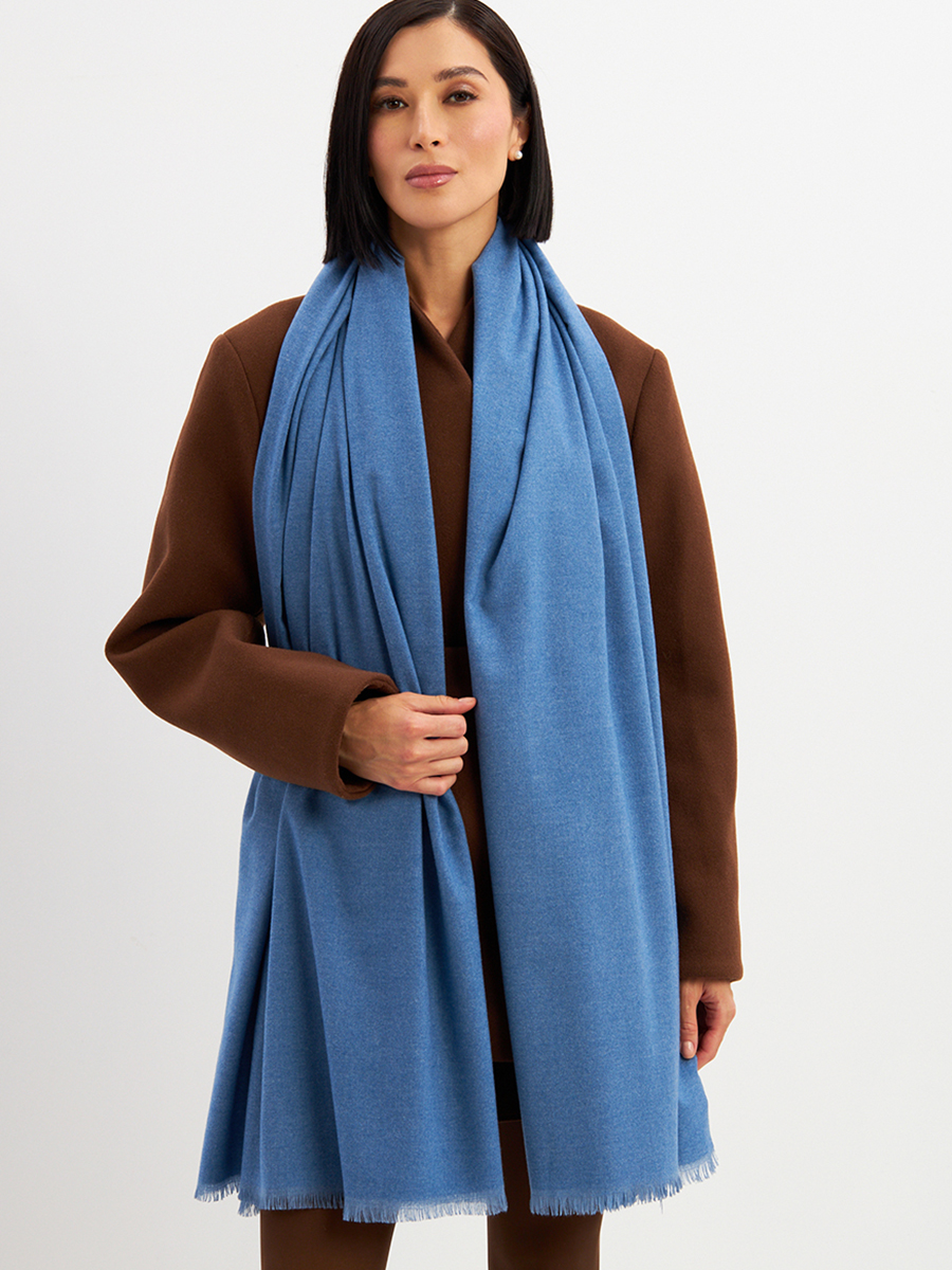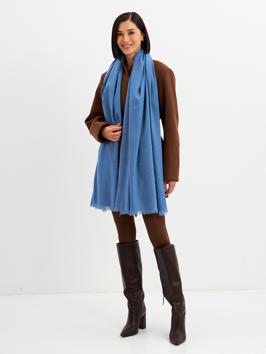 Большой, мягкий, теплый двусторонний однотонный палантин. Края изделия украшены бахромой. Машинная деликатная стирка. Шерсть 20% Модал 45% Вискоза 35%