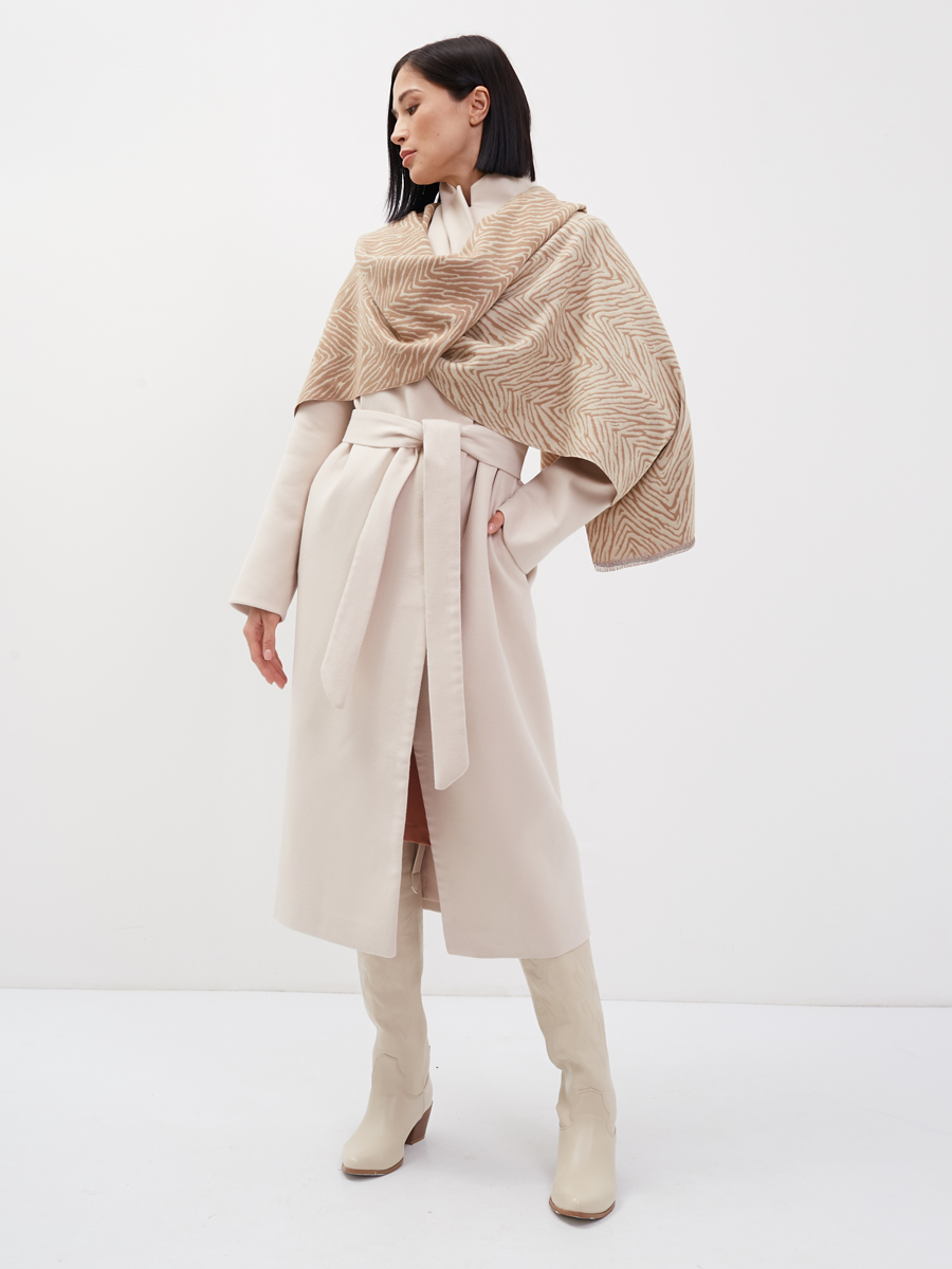 Большой, мягкий, теплый двусторонний палантин с принтом. Края изделия украшены кистями. Только ручная стирка. 45% Модал, 20% Шерсть, 20% Вискоза, 15% Кашемир