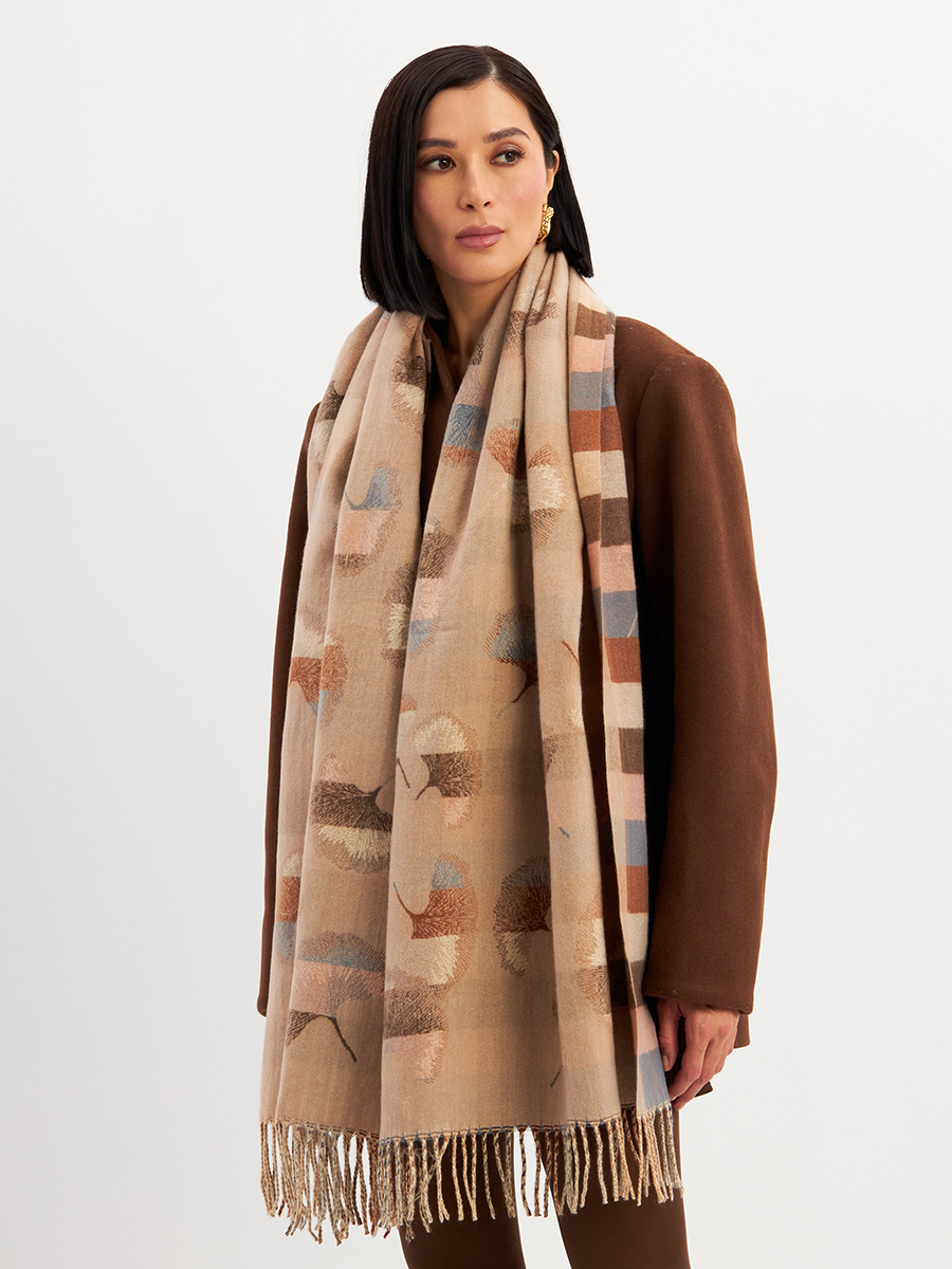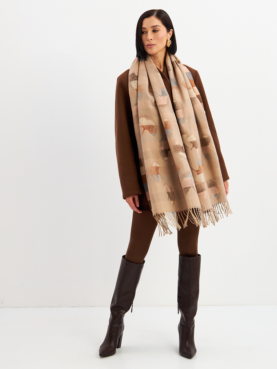 Большой, мягкий, тонкий и очень нежный палантин с рисунком. Края изделия украшены бахромой ручной работы. Машинная деликатная стирка.