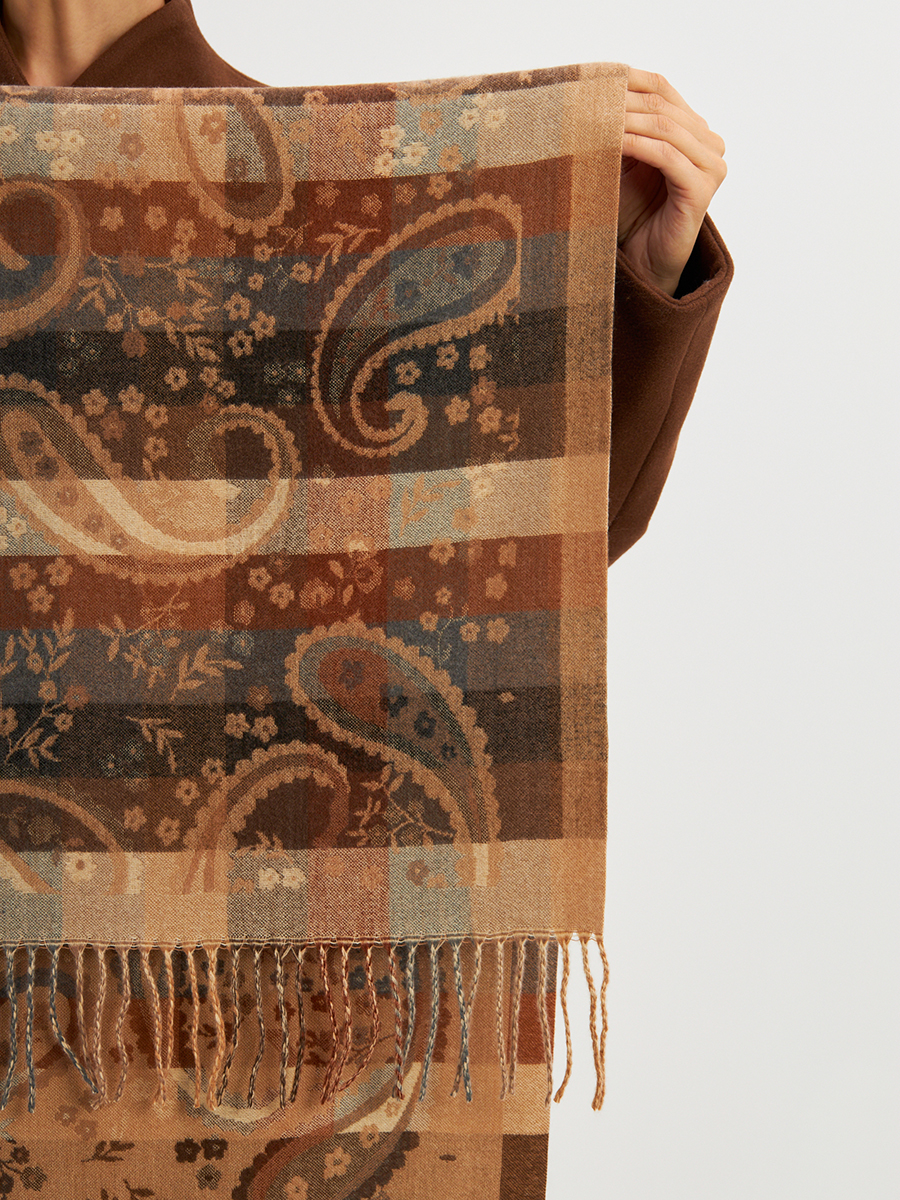 Большой, мягкий, теплый и очень нежный палантин с рисунком. Края изделия украшены бахромой ручной работы. Машинная деликатная стирка. 55% вискоза/ 25% кашемир/ 20% шерсть