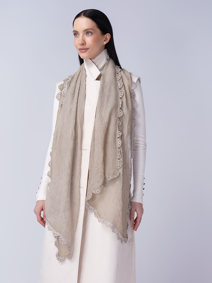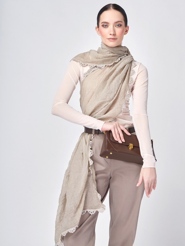 Представляем вашему вниманию элегантный женский палантин SHUT-15-4, который станет жемчужиной ассортимента вашего бутика или шоурума. Созданный на собственном производстве TANTINO с полным циклом, этот палантин воплощает в себе безупречное качество материалов, точность кроя и актуальный дизайн, что делает его крайне привлекательным для вашей целевой аудитории.Данная модель выполнена из невероятно мягкой, тонкой и нежной ткани, которая дарит ощущение комфорта и легкости при каждом прикосновении. Универсальный бежевый оттенок с деликатной жатой текстурой и изысканным кружевным декором по периметру придает аксессуару особую утонченность и шарм. Это не просто палантин, это воплощение женственности и стиля, способное преобразить любой образ.Преимущества для ваших клиентов и вашего бизнеса:Высокое качество материалов: Тонкое, но прочное полотно гарантирует долговечность изделия и сохранение его первозданного вида.Изысканный дизайн: Деликатное кружево и универсальный бежевый цвет делают палантин универсальным, легко сочетающимся с различными стилями одежды – от классического до кэжуал.Многофункциональность: Большой размер позволяет носить его как шарф, накидку на плечи или стильный головной убор, предлагая широкий спектр использования.Привлекательность для покупателей: Элегантность и комфорт этого палантина обеспечат высокий спрос и положительные отзывы среди ваших клиентов.Простота ухода: Несмотря на деликатность, требуя ручной стирки, палантин сохраняет свои качества, что подчеркивает его эксклюзивность.Включите палантин SHUT-15-4 в свой ассортимент, чтобы предложить покупателям аксессуар, сочетающий в себе роскошь, комфорт и универсальность. Мы гарантируем стабильность поставок и исключительное качество, подтвержденное полным циклом нашего производства. 55% полиэстер, 25% вискоза, 20% хлопок