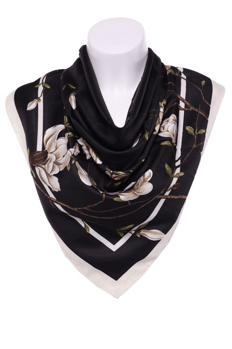 Легкий платок из мягкого искусственного шелка с принтом. Обработка кромки-подрубка.