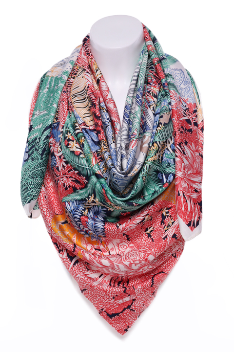 Большой платок из мягкого искусственного шелка с принтом. Обработка кромки-подрубка.