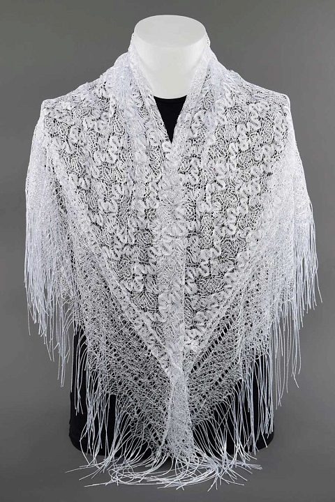 Платок выполнен из мягкой кружевной ткани, концы - бахрома.