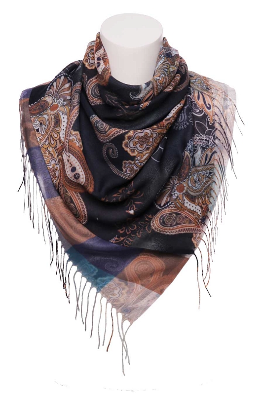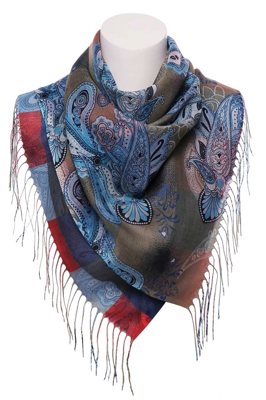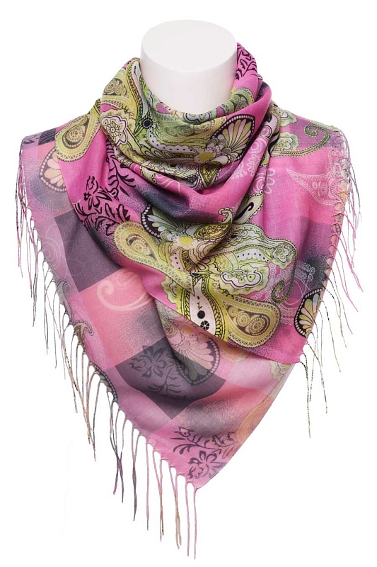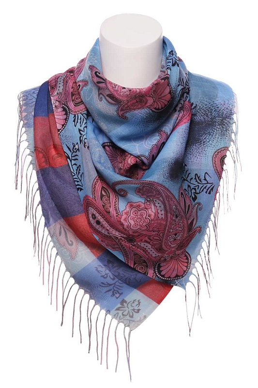 Платок мягкий, тонкий. Одна сторона - рисунок, другая сторона - клетка. На двух противоположных краях кисти, два других заканчиваются кромкой.