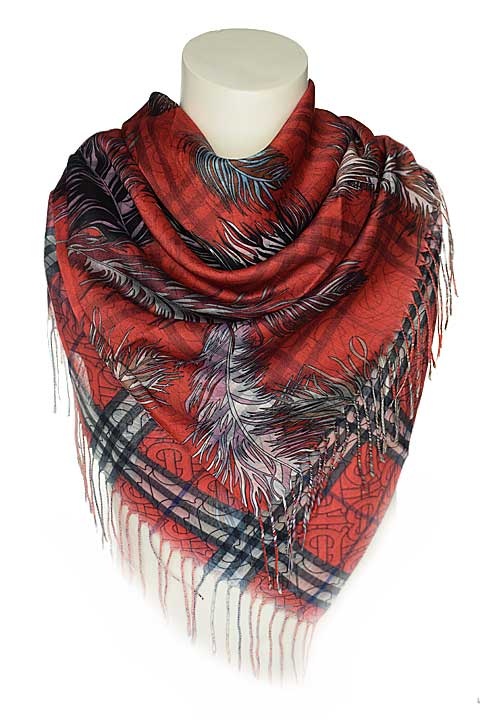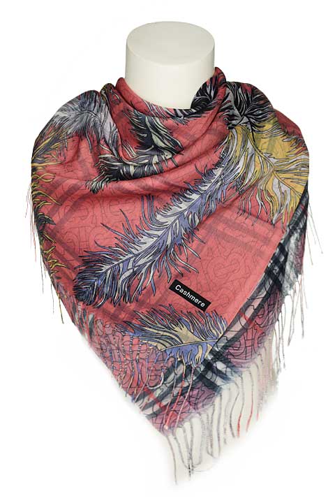 Мягкий, тонкий платок. Одна сторона - перышки, другая сторона - клетка. Края платка заканчиваются кромкой, концы - бахрома.