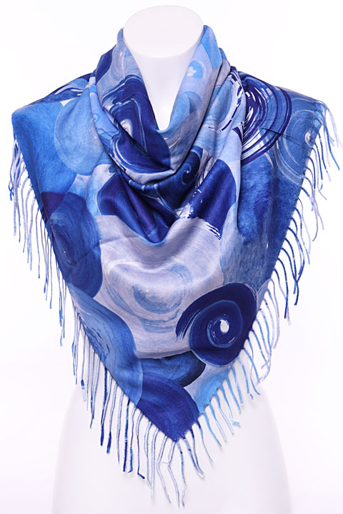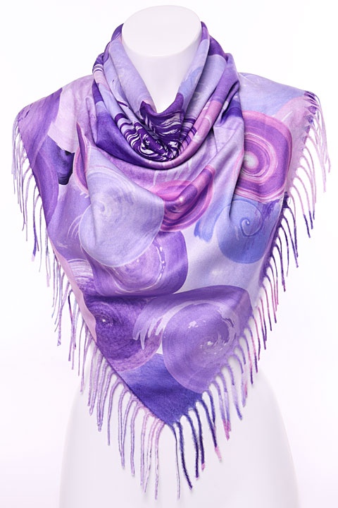 Мягкий, плотный двухсторонний платок. Одна сторона - круги, другая сторона - разводы. На двух противоположных краях кисти, два других заканчиваются кромкой.