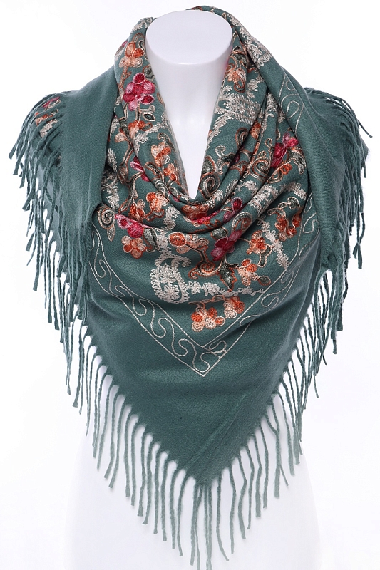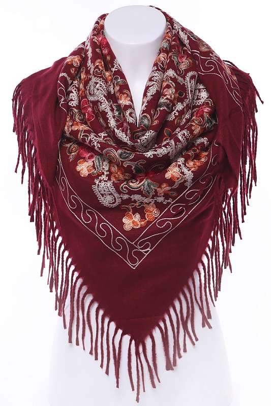 Теплый, мягкий, уютный платок с вышивкой. На двух противоположных краях платка кисти, два других заканчиваются кромкой.
