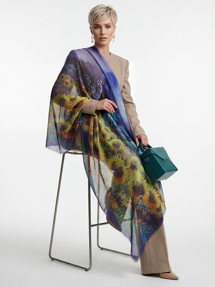 Большой, красивый двусторонний платок с рисунком в стиле "арт-деко"и необычной текстурой ткани. Края изделия украшены бахромой. Только ручная стирка. Шелк 15% Хлопок 45% Вискоза 40%