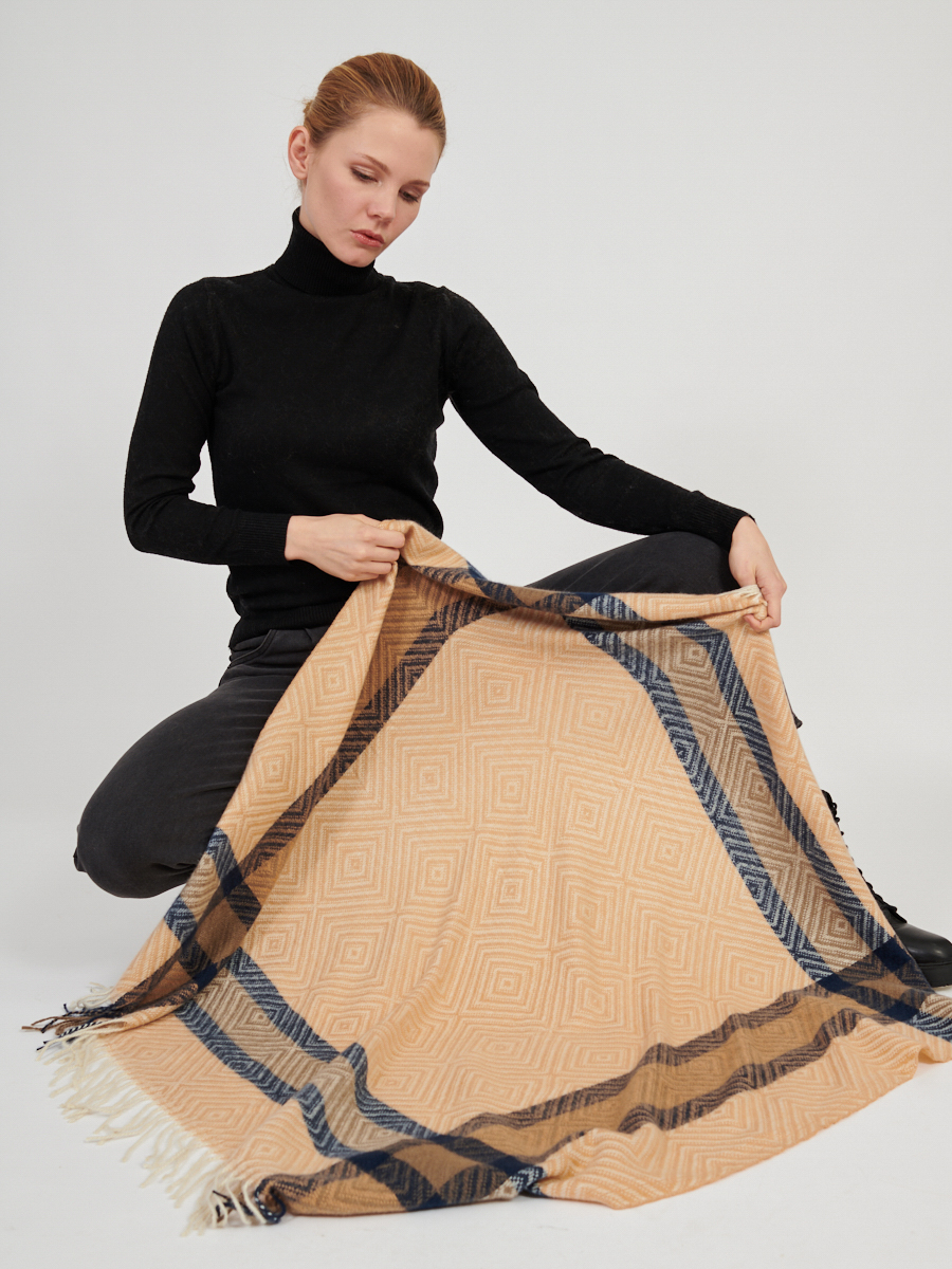 Большой красивый платок из мягкой, хорошо драпируемой ткани, в стиле "арт-деко". По периметру изделие украшено бахромой. Только ручная стирка. Шерсть 25%, Вискоза 35%, Модал 40%