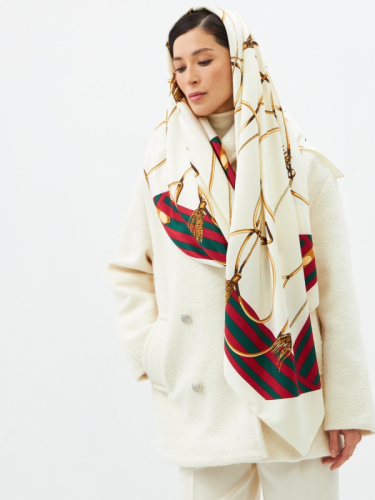 Большой, красивый двусторонний платок с рисунком в стиле "арт-деко" и атласной текстурой ткани. Края изделия аккуратно обработаны. Машинная деликатная стирка. Полиэстер 60%, Вискоза 30%, Шелк 10%