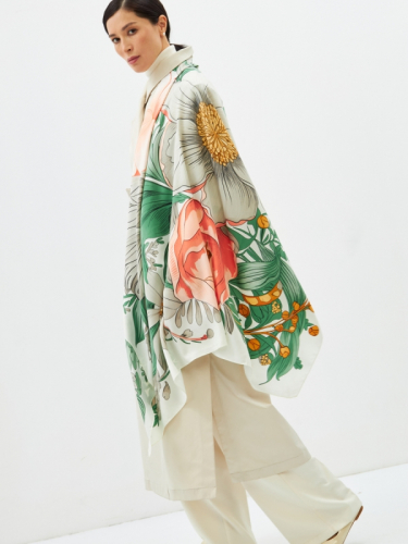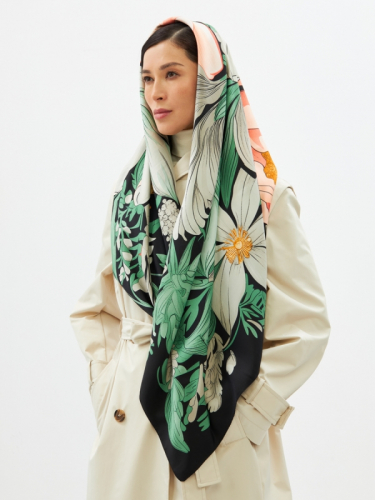 Этот двусторонний платок притягивает взгляд роскошным арт-деко рисунком, где крупные стилизованные цветы и листья в оттенках бежевого, зеленого и кораллового создают неповторимый образ. Атласная текстура ткани придает изделию благородный блеск и невероятную мягкость, обеспечивая изысканный внешний вид.