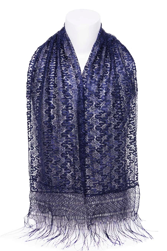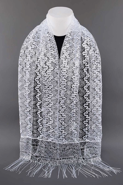 Шарф выполнен из мягкой кружевной ткани. Края шарфа- оверлочный шов, концы - бахрома.