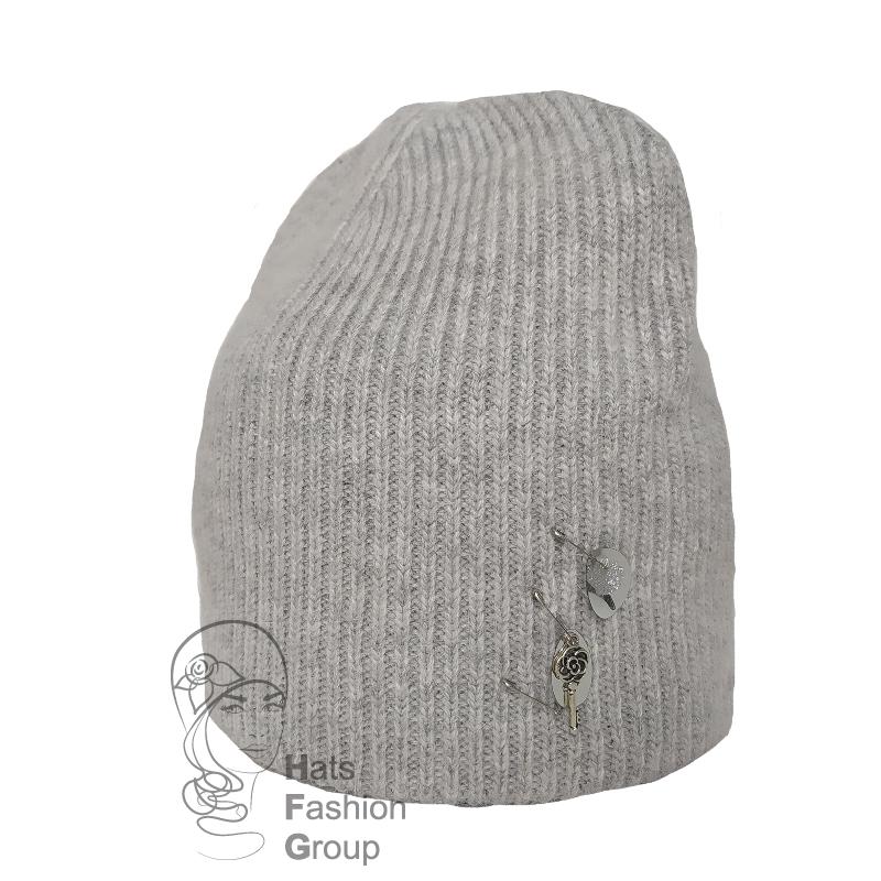 Молодежная двойная шапка-бини из шерстяной пряжи с добавлением ангоры. Сбоку украшена тремя маленькими булавками, которые дополняют крупные пайетки в тон пряжи и стилизованный металлический ключик.
