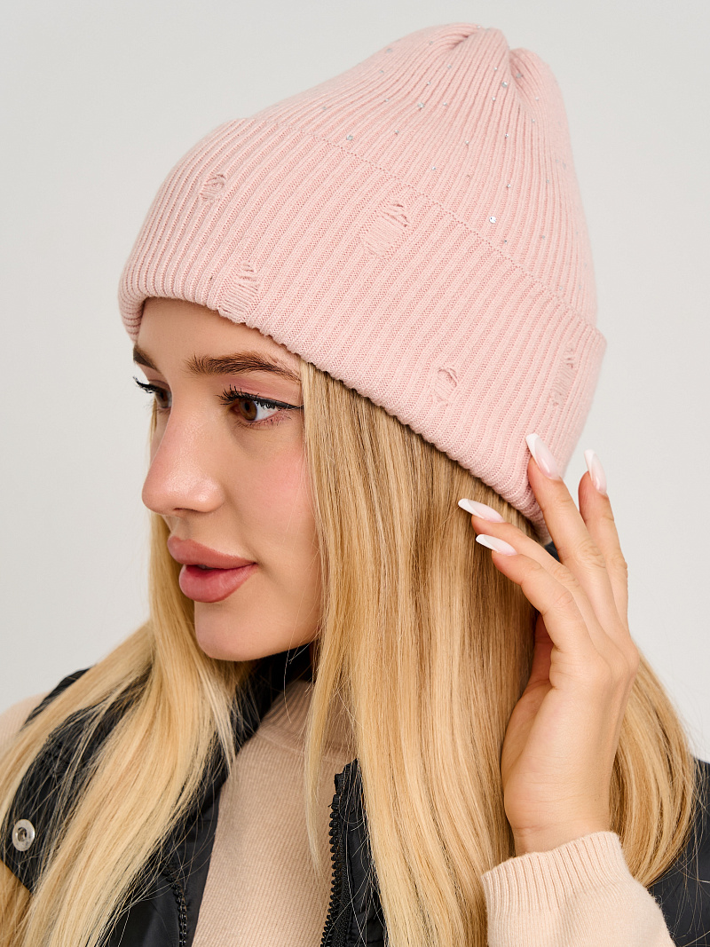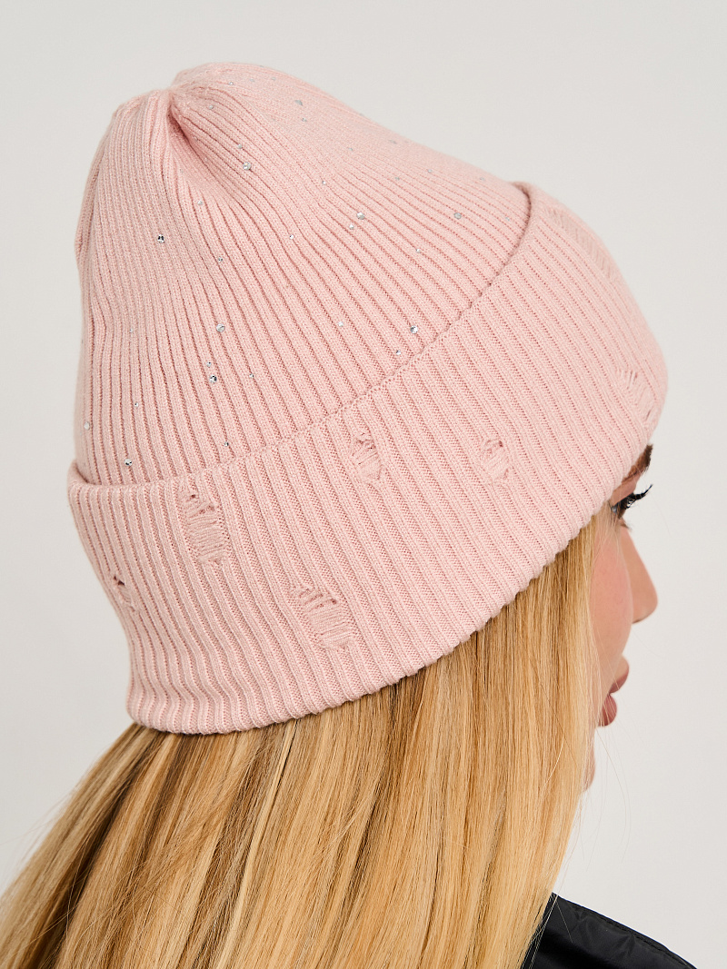 Шапка двойная с кашемиром, с отворотом, "рваный" дизайн. Тренд на рваный трикотаж набирает обороты. Базовая молодежная шапка с отворотом и россыпью страз.