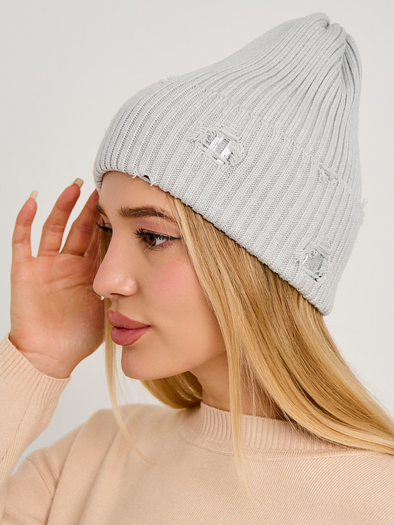 Шапка одинарная с кашемиром, с отворотом с  "рваным" эффектом,  с металлическим декором.