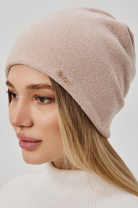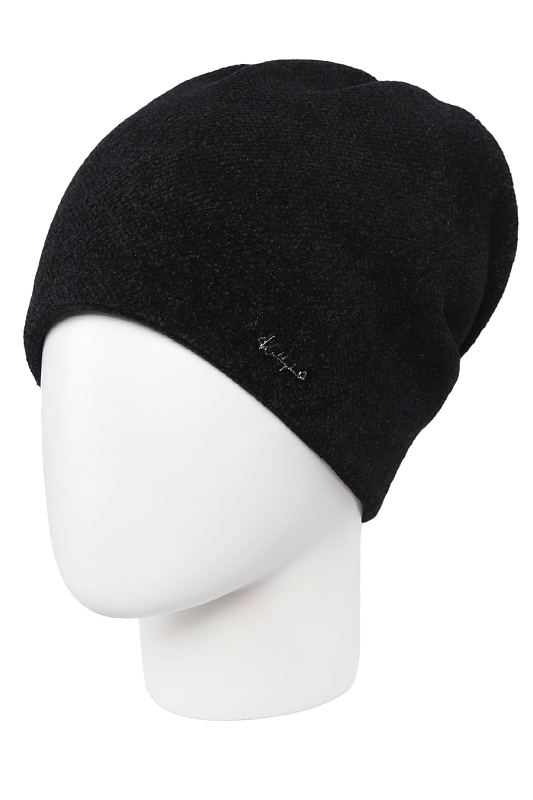 Шапка двойная из мягкой плюшевой пряжи с нитями люрекса. Сзади модель оформлена драпировкой и закреплена строчкой. Вязка плотная, гладкая.