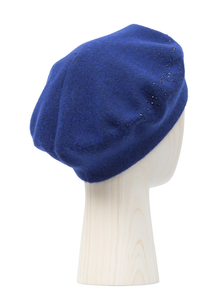 Классический женский берет на ножке, выполненный из теплой пряжи с альпакой. Модель дополнительно утеплена трикотажным подвязом с хлопковыми нитями в составе. Берет декорирован россыпью страз по правой стороне модели, которые создают легкое мерцание при любом освещении.