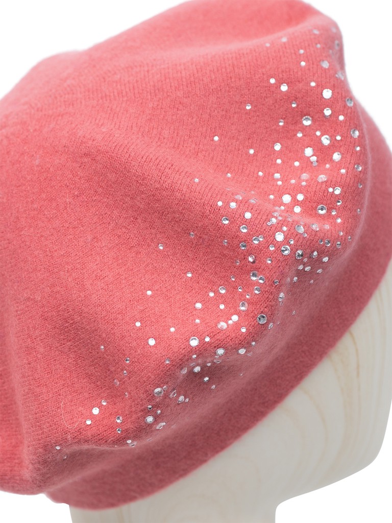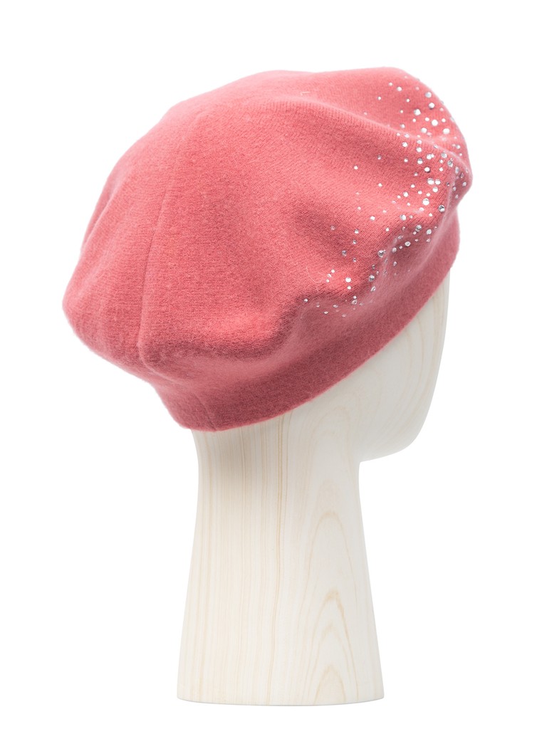 Классический женский берет на ножке, выполненный из теплой пряжи с альпакой. Модель дополнительно утеплена трикотажным подвязом с хлопковыми нитями в составе. Берет декорирован россыпью страз по правой стороне модели, которые создают легкое мерцание при любом освещении.