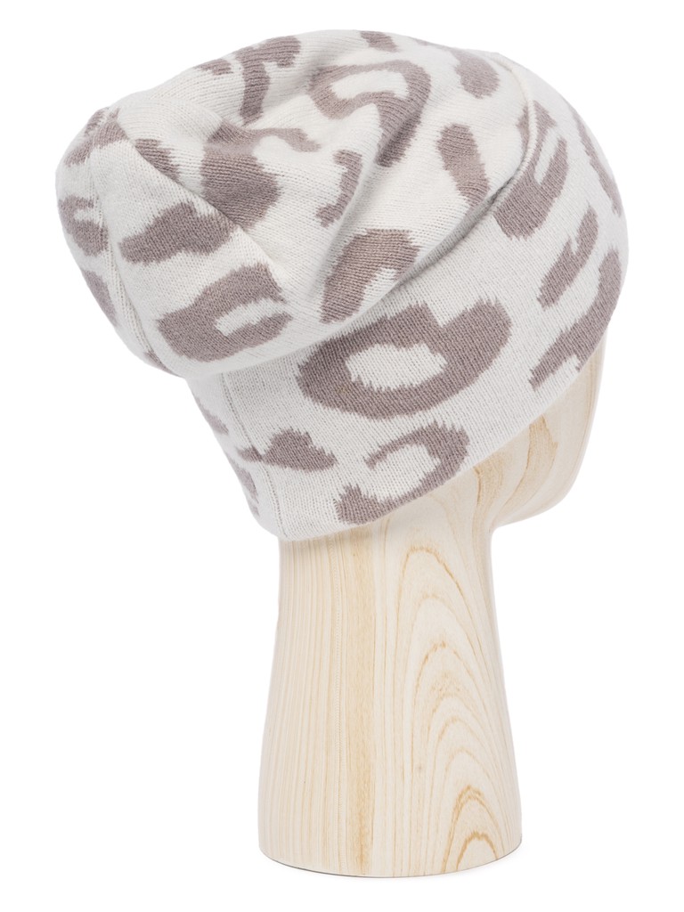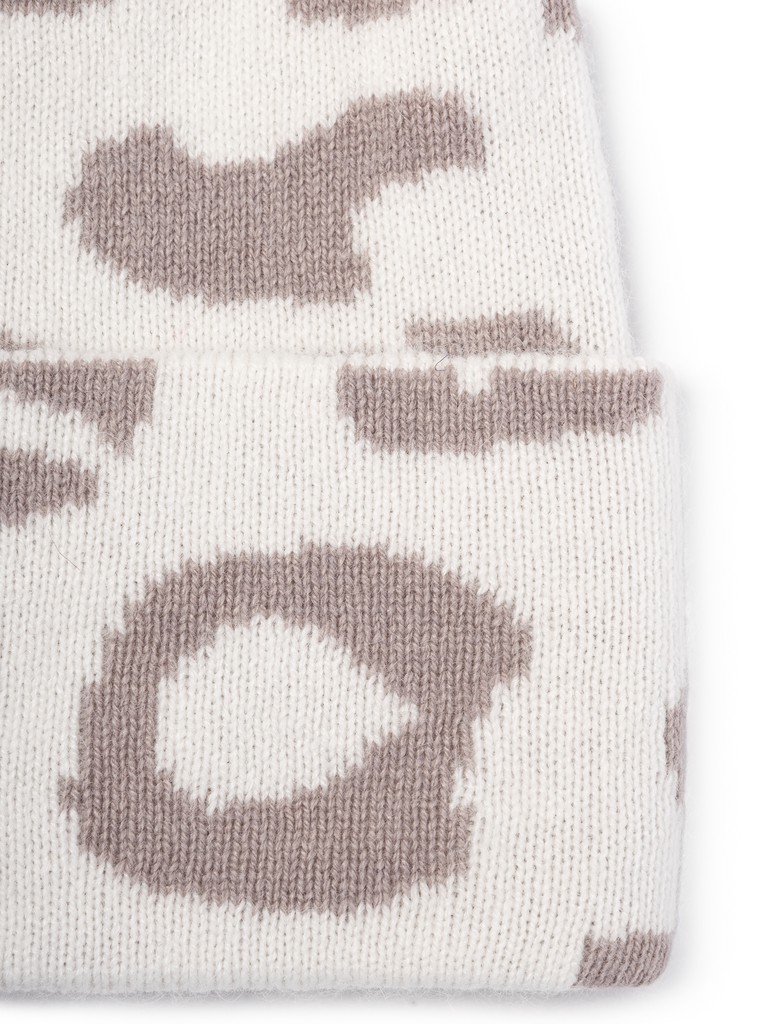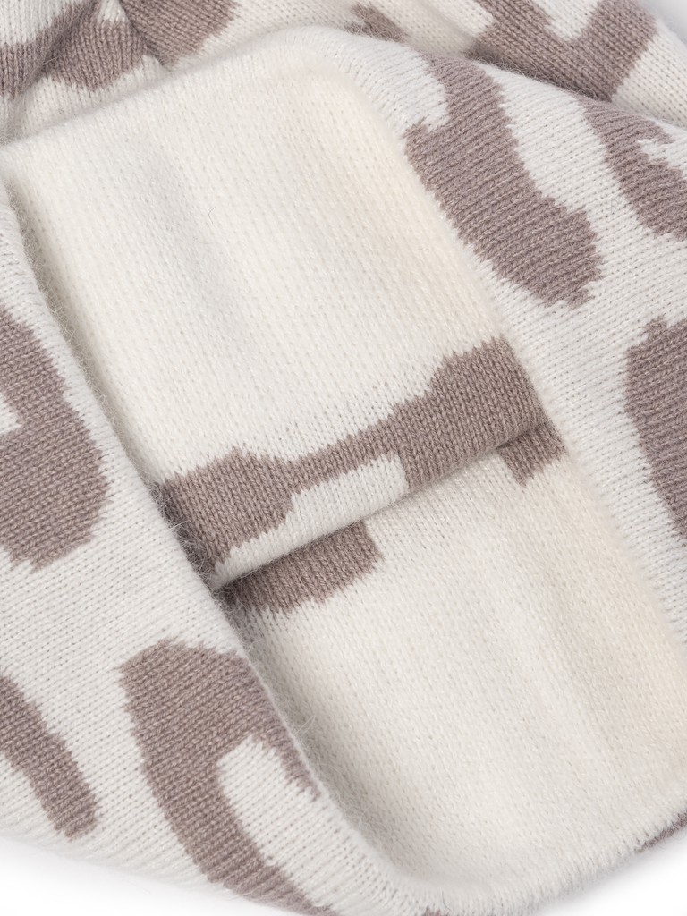 Классическая форма шапки-бини с отворотом выполнена из итальянской пряжи с добавлением ангоры. Особенности - монохромный анималистичный принт.