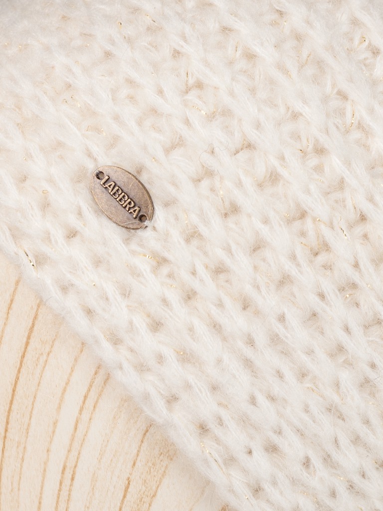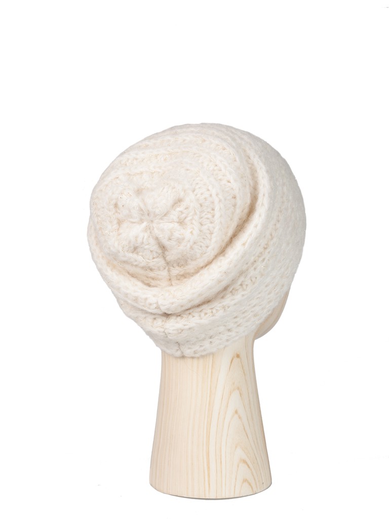 Классическая форма шапки-бини выполнена из смесовой пряжи с мохером в составе. Необычная поперечная вязка, деликатное добавление в пряжу люрексной нити. Классический, и в то же время запоминающийся аксессуар.