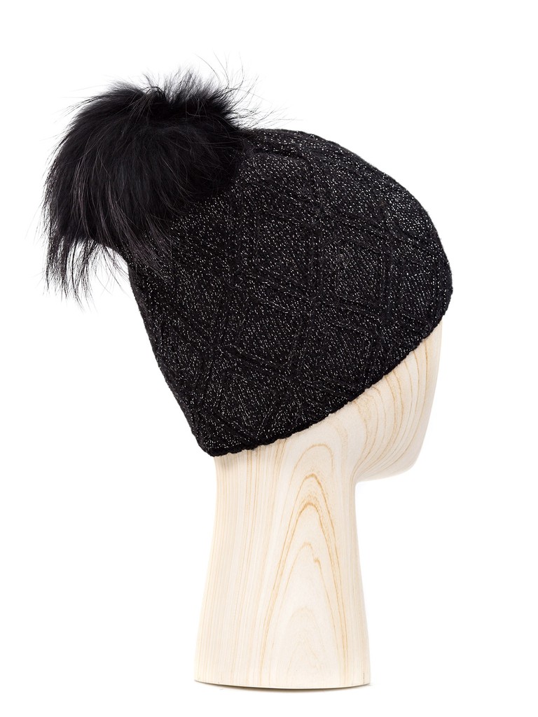 Классическая форма шапки-бини из смесовой пряжи с  ангорой и кашемиром. Верхняя часть шапки выполнена из пряжи с добавлением люрексной нити.  А съёмный помпон из натурального меха енота, покрашенный в тон пряжи идеально завершает красивое изделие!