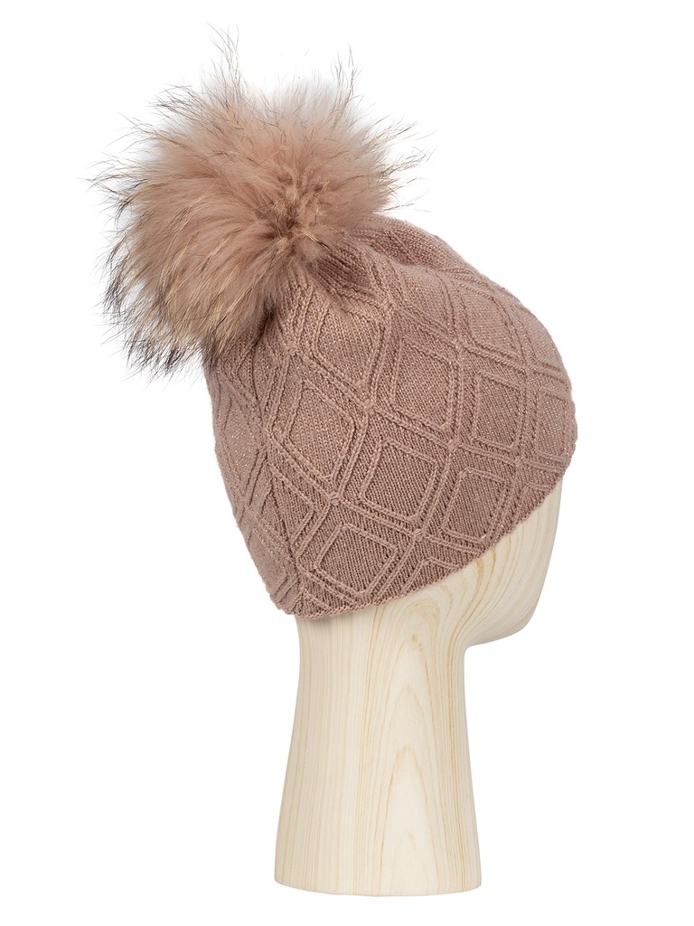 Классическая форма шапки-бини из смесовой пряжи с  ангорой и кашемиром. Верхняя часть шапки выполнена из пряжи с добавлением люрексной нити.  А съёмный помпон из натурального меха енота, покрашенный в тон пряжи идеально завершает красивое изделие!