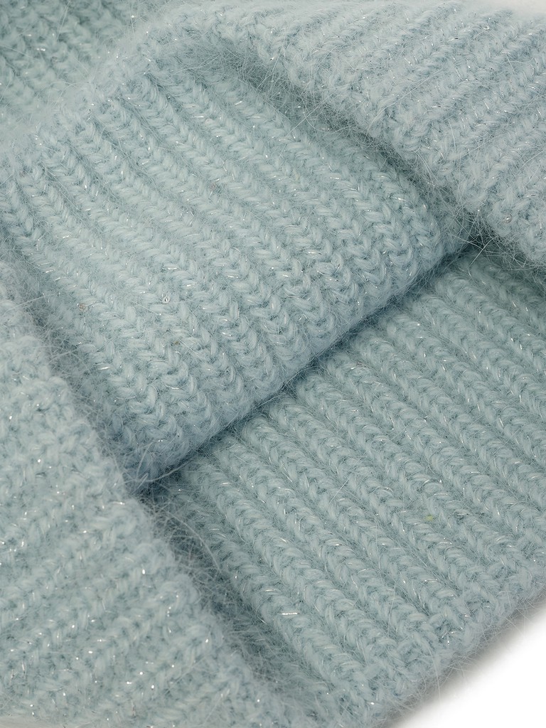 Классическая форма шапки-бини, выполненная из итальянской пряжи с высоким процентным содержанием ангоры в составе. В плетение добавлена  люрексная нить в тон пряжи и мелкие пайетки с легким мерцанием. Шапка с плотным подвязом, позволит Вам оставаться в тепле даже в самые сильные морозы!