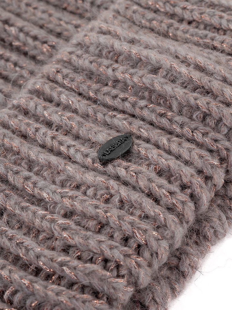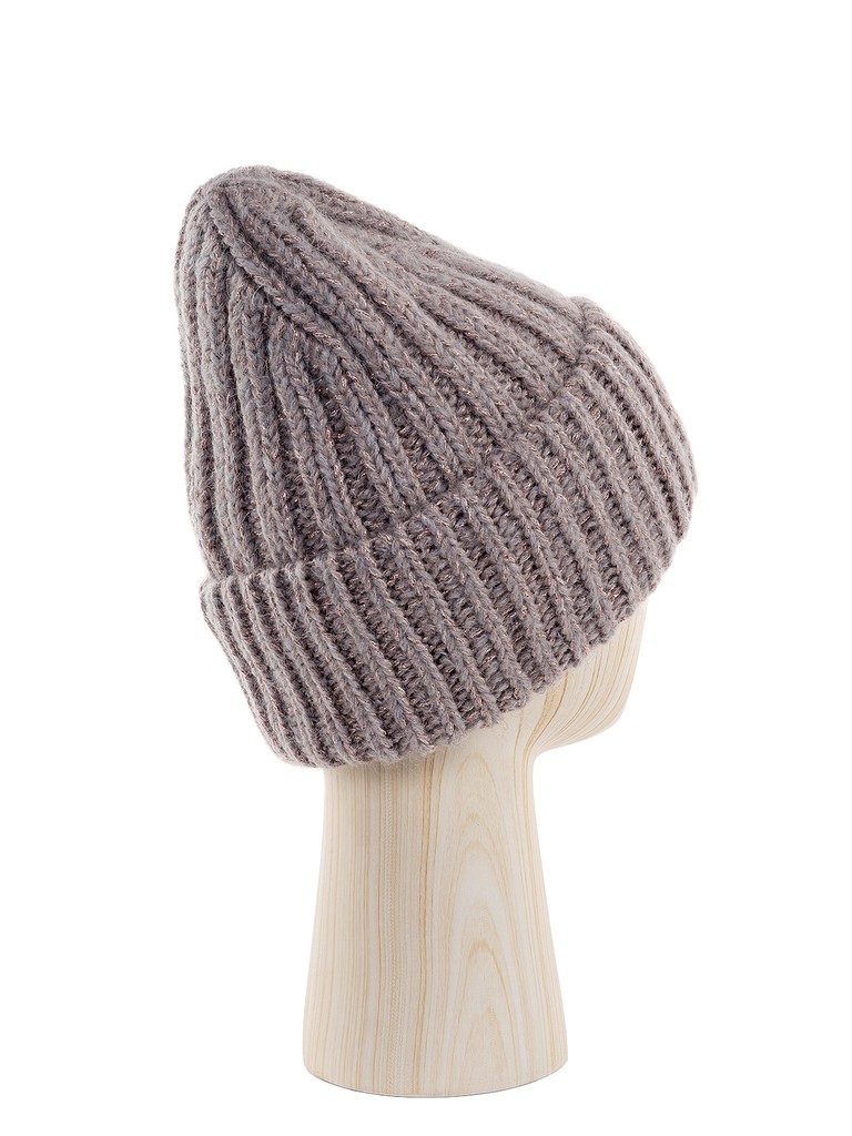 Ультрамодная шапка бини с увеличенным верхом и широким отворотом. Выполнена из высококачественной итальянской пряжи с добавлением в составе нитей кид-мохера. Шапка украшена вплетением люрексных нитей, что придает деликатное мерцание.