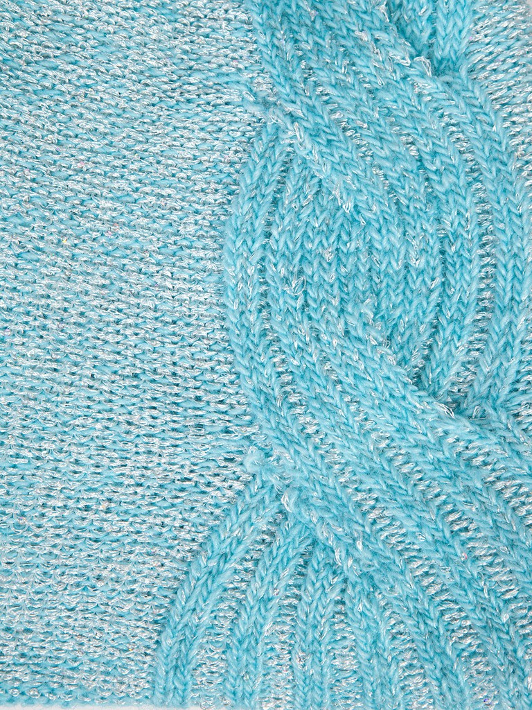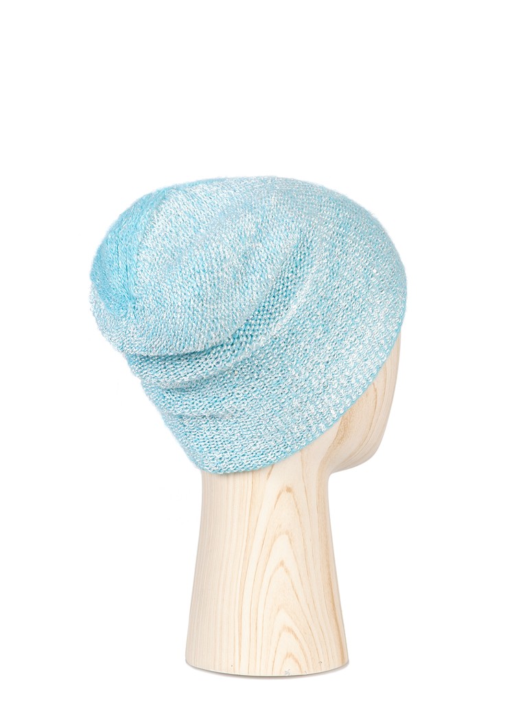 Классическая форма шапки-бини, выполнена итальянской пряжи. Легко драпируется. Приятным акцентом становится добавление нити с мелкими пайетками. Необычной особенностью становится ассиметричное плетение широкой косы по левой стороне.