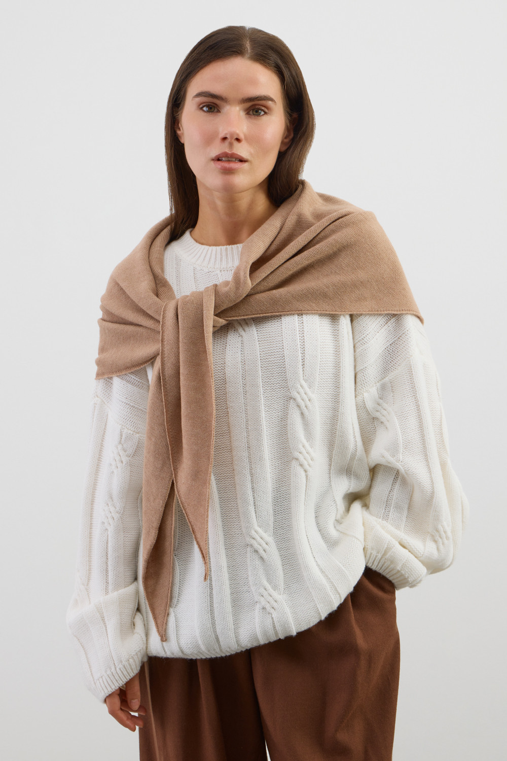 Мягкая вязаная косынка из шерсти и акрила станет стильной заменой шапке. Шерсть в составе сохраняет тепло, а волокна акрила придают изделию мягкость и объем.