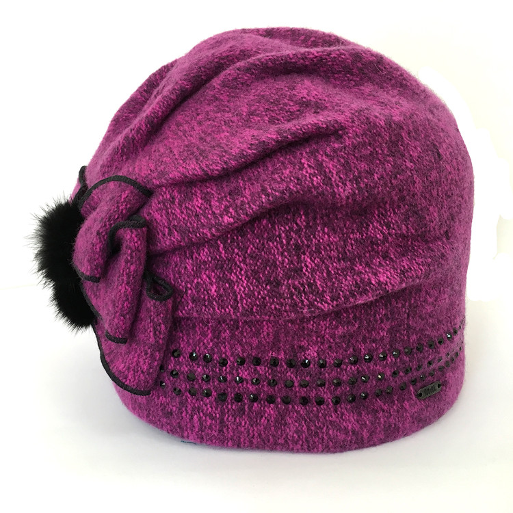 Элегантная женская шапка-бандана меланжевой расцветки с подкладкой из флиса. Украшена фирменной шильдой сбоку и стразми по окружности головы. Сзади шапка оформлена тройным бантом, украшенным маленькими помпонами из натурального меха. Декоративные защипы придают дополнительный объем.