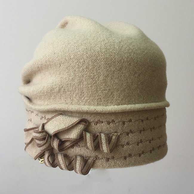 Элегантная женская шапка-бандана из шерсти с закрепкой и драпировкой складок сзади, придающих дополнительный объем. По окружности шапка украшена шёлковой вышивкой, сбоку – изящная композиция из лент основного полотна и фирменная металлическая шильда.