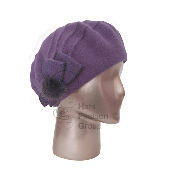 Элегантный женский берет из 100% шерсти. Украшен стилизованным бантом, выполненным из основного полотна, и небольшим помпоном из натурального меха. Дополнительный объем изделию придают ассиметричные отстрочки.
