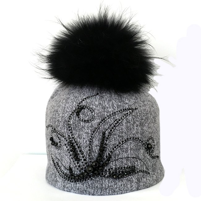 Молодежная шапка из шерсти меланжевой расцветки с подкладкой из флиса. Флисовая подкладка делает изделие комфортным в носке. Помпон съемный из натурального меха. Сбоку украшена композицией из вышивки, черных бусин и страз.