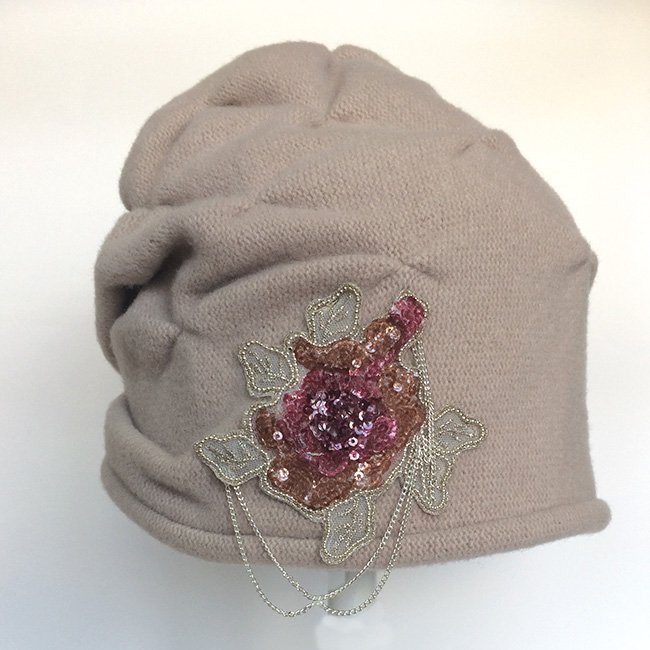 Стильная женская шапка – бандана с небольшим руликом по краю шапки. Украшена по всему полю шапки оригинальными защипами, создающими объемный рисунок «ромбы» и сбоку – изящной аппликацией «цветок», выполненной на сетке из цветных пайеток с добавлением ювелирных страз и тонких металлических цепочек.