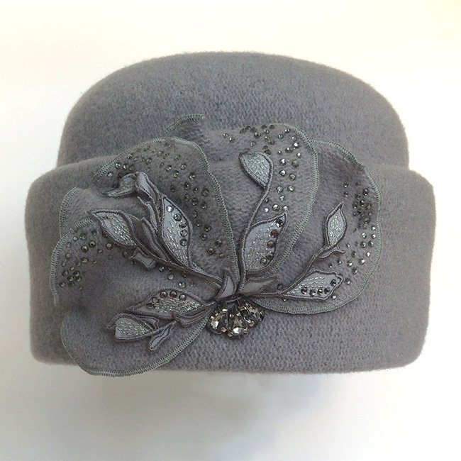 Элегантная шапка-кубанка из шерсти. Сбоку украшена декоративной композицией из основного полотна с россыпью мелких страз и изящной аппликацией из шелка, расшитой серебристой нитью. Завершает композицию брошь из трех крупных ювелирных страз.