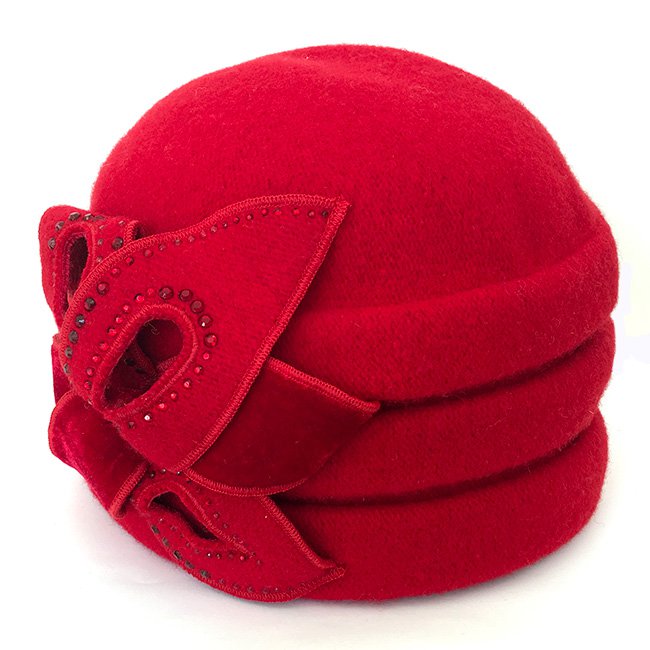 Женская элегантная шерстяная шапка по голове. Сбоку украшена композицией в виде крупных лепестков, выполненных из основного полотна и велюра. Дополняют композицию стразы. Крупные складки по окружности придают дополнительный объем.