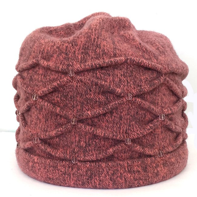 Женская шапка-бандана из 100% шерсти меланжевой расцветки, с подкладкой из флиса. Флисовая подкладка делает изделие комфортным в носке. Украшена декоративными защипами в виде ромбов и бусинами в цвет изделия.