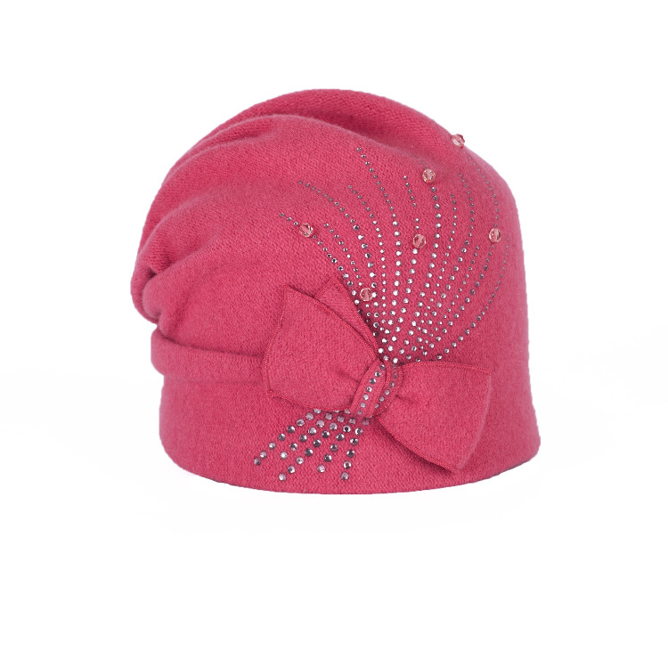 Элегантная женская шерстяная шапка-бандана с драпировкой складок и декоративными заципами сзади, придающими объем изделию. Сбоку украшена бантом из основного полотна, орнаментом из страз и бусин в тон шапки.