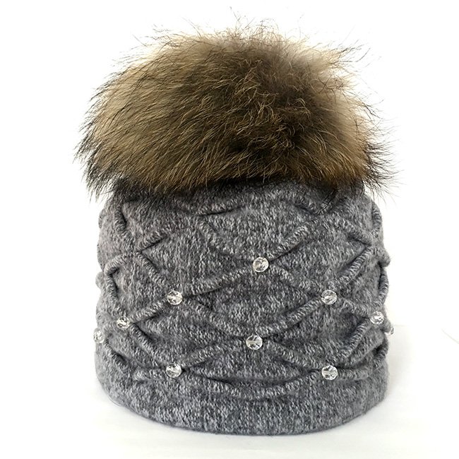 Женская шапка из 100% шерсти меланжевой расцветки, с подкладкой из флиса. Флисовая подкладка делает изделие комфортным в носке. Украшена декоративными защипами в виде ромбов и бусинами, большим натуральным помпоном в цвет изделия. Помпон