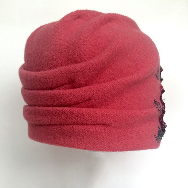 Модная женская шапка-бандана с драпировкой складок сзади. Сбоку украшена яркой двухцветной аппликацией в виде цветка розы, выполненной вышивкой гладью шелковыми нитями, и изящным рисунком "гусиная лапка" из черных мелких страз .