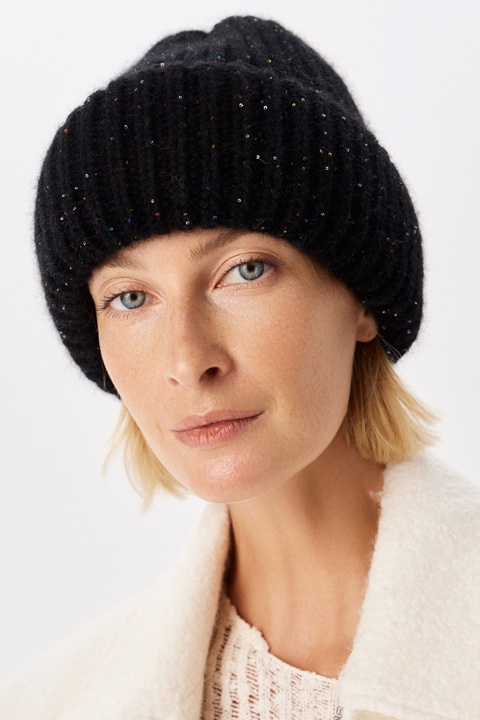 Шапка с двойным отворотом на флисовом подкладе. Выполнена из мягкой, пушистой пряжи с пайетками.