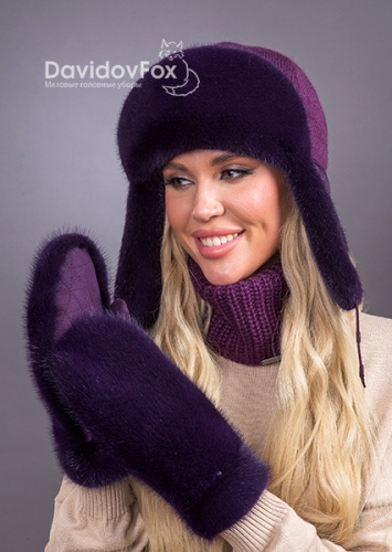 Комплект ушанка норка трикотаж аврора, манишка, рукавички замша