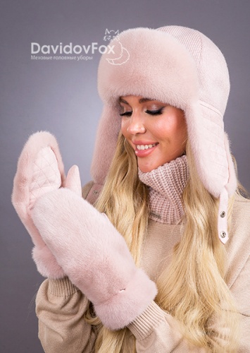 Комплект ушанка норка трикотаж дымчатая роза, манишка, рукавички замша