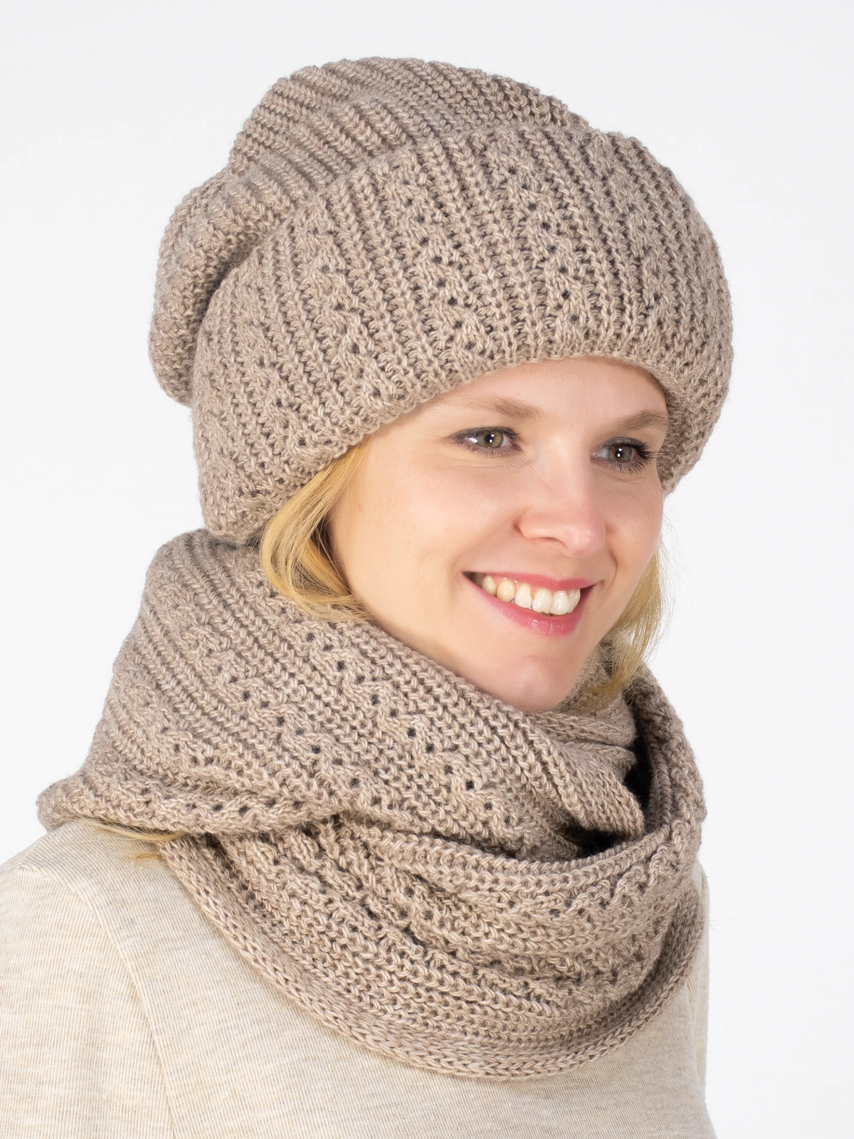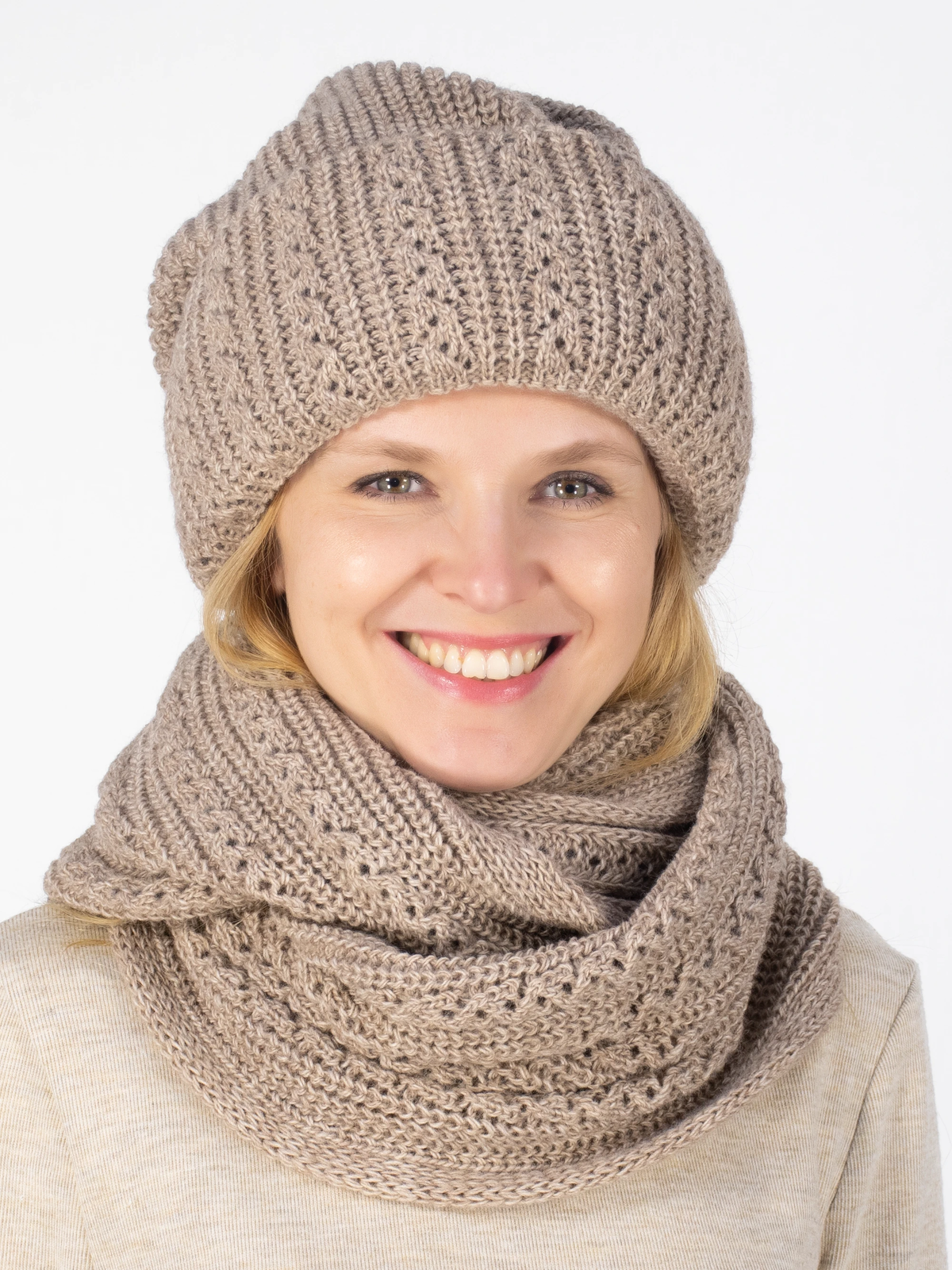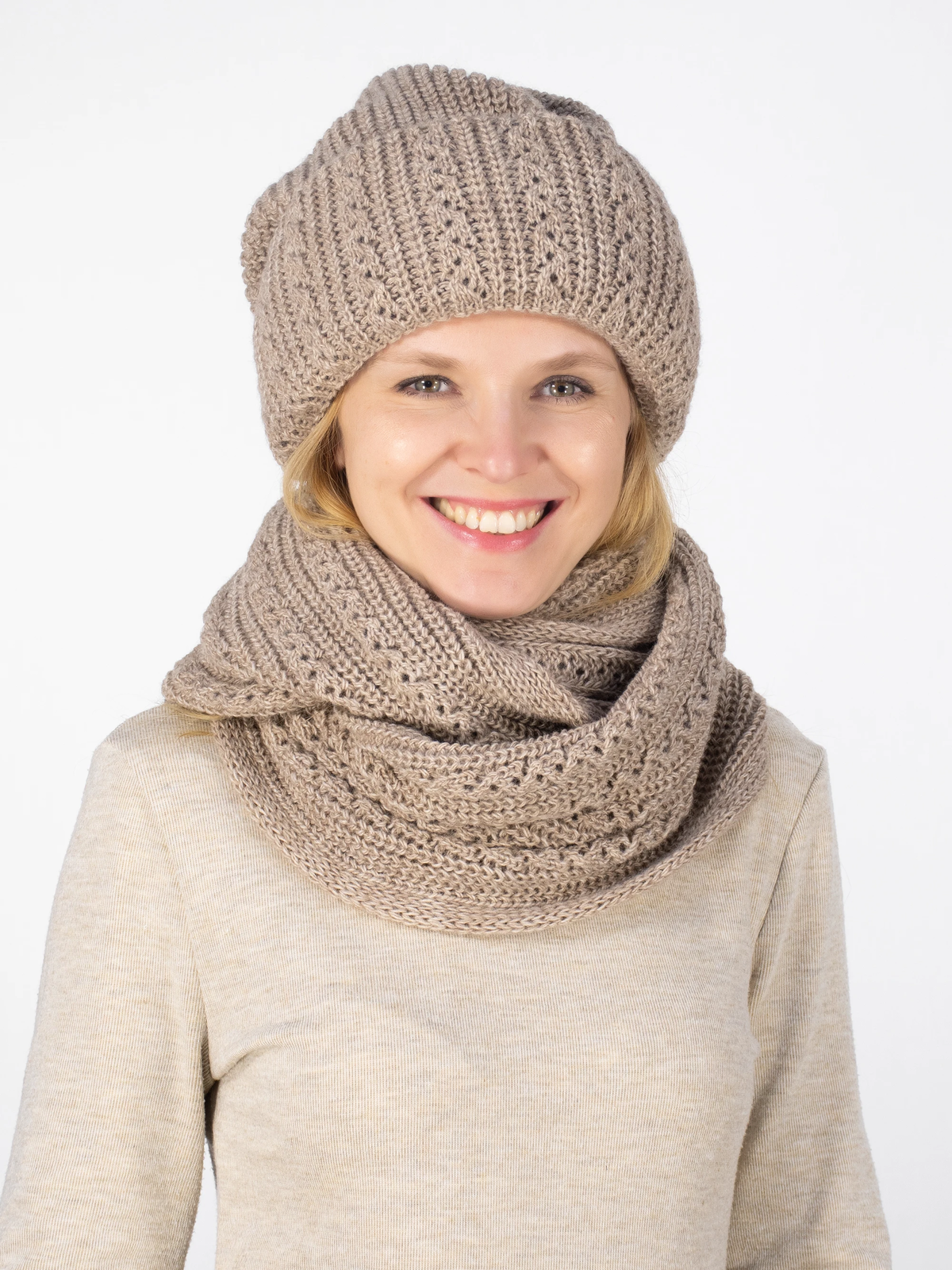 Комплект зимний женский шапка+снуд Ажур (Цвет светло-коричневый), размер 56-58, шерсть 30%