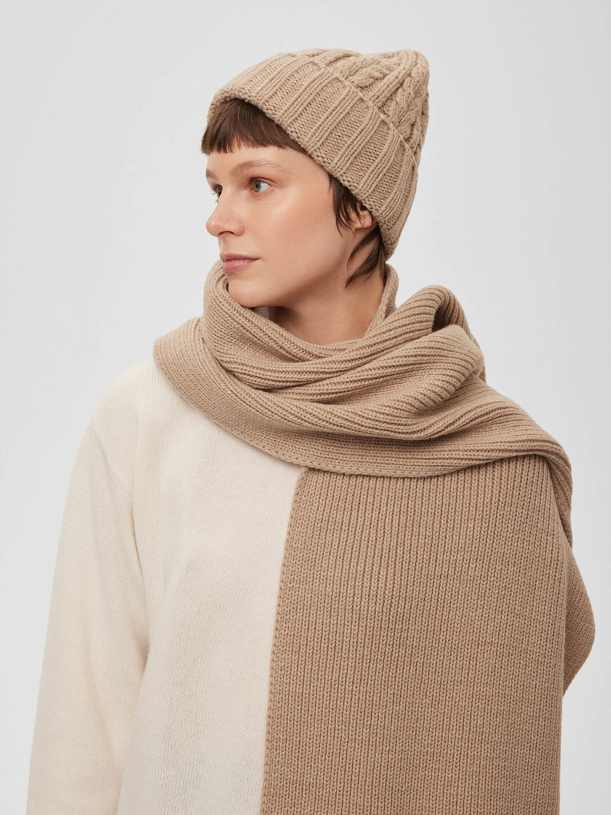 Шапка крупной вязки из шерсти мериноса с косами и отворотом.