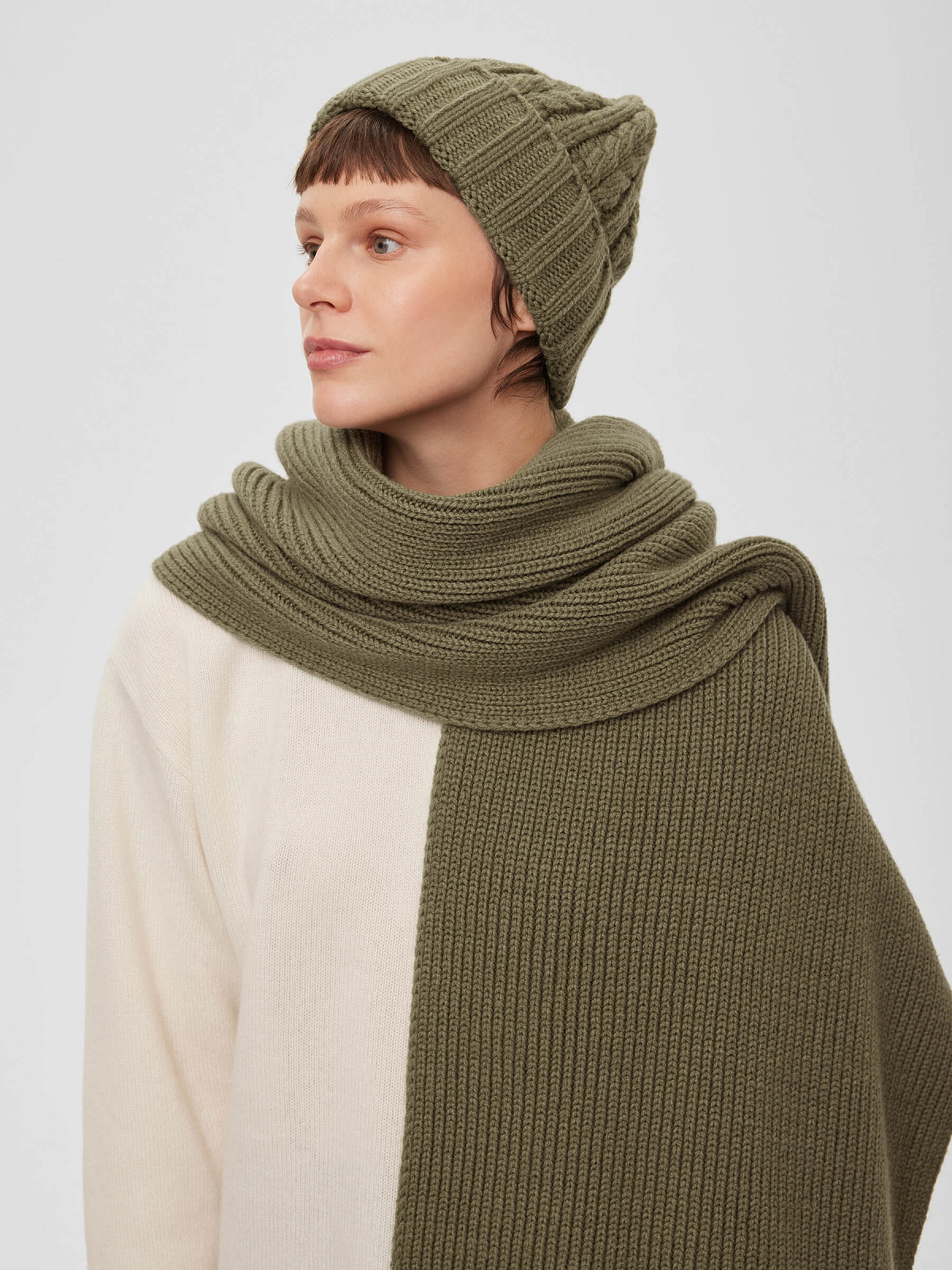 Шапка крупной вязки с косами, светлый хаки